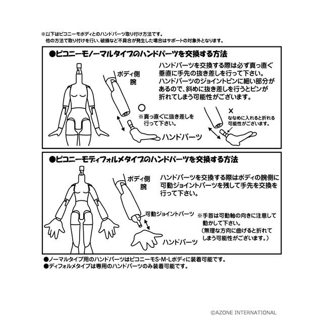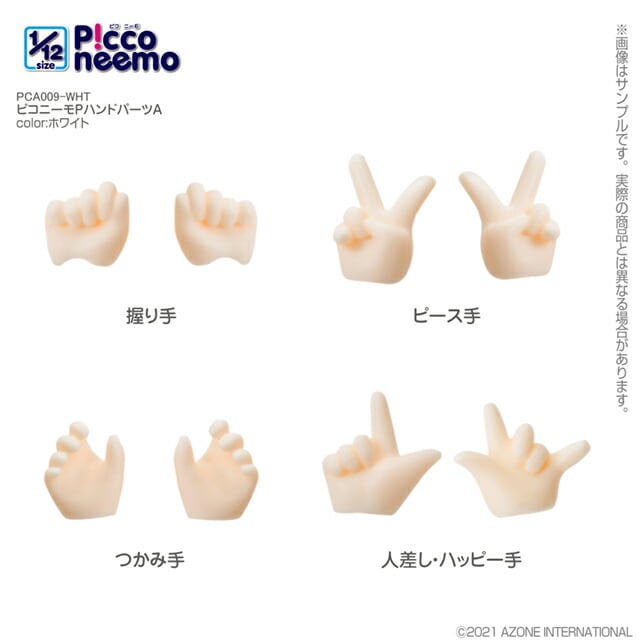 「ピコニーモP」素体用のハンドパーツです。適応できるか使用予定ボディの種類を必ず確認してください。誤って購入された場合でも返品はお受けしかねます。<br>なお、在庫の変動が激しいため、店頭ならびにメーカー在庫が欠品の場合はキャンセルをお願いする場合がございます。